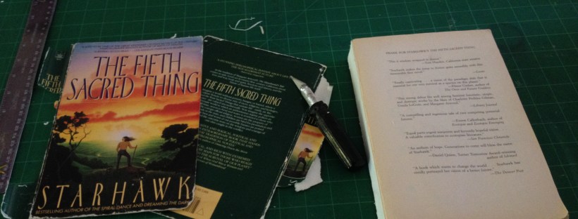 A few months ago I donated most of my books in an effort to live minimally. Those books that I did keep are the ones which I reread or that I have a special attachment to. Even though some of these books are old or falling apart after years of reading, I still want to hold on to them. I have made a notebook from scratch before and when I was ten, created a hardcover for my copy of Eragon with some success. I have decided to relearn that skill, improve upon it and to make new hardcovers for all of my books which are not already beautiful. This is an art project perfect for minimalism as you do not end up with more things than you started out with, only more beautiful ones. For my first attempt, I decided to start simple and create a cover for my copy of The Fifth Sacred Thing in black cloth with a patterned paper for the lining. I mostly followed this instructables tutorial though I did make a few changes most notably the addition of faux headbands created by folding two pieces of cloth in half (see image 2 below). I find their addition to greatly add to the complete look of the book. The entire process of creating a hardcover is easier than one might think, though it is important to pay attention to every minor detail especially early on. One thing which I have yet to do is mark the title and author on the outside of the book. I am currently looking for a set of alphabet stamps that will allow every book to have a uniform feel when viewed together. I plan on creating more covers and on trying new techniques. Hopefully, my library will only expand in quality, not quantity.
