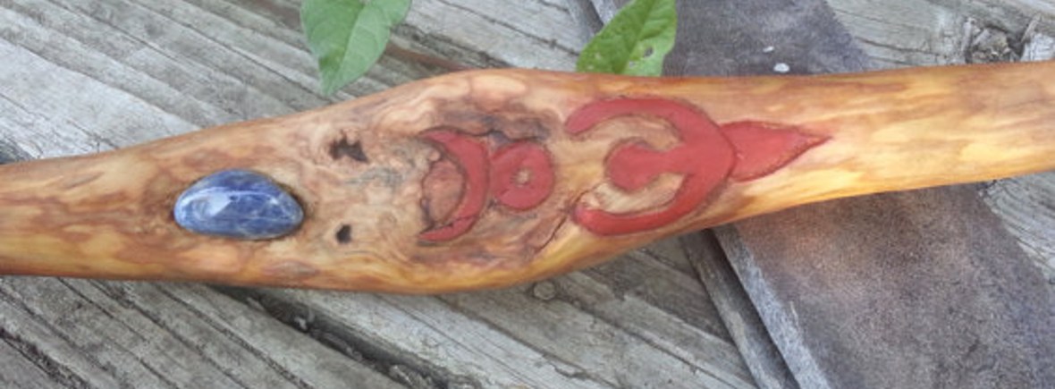 This wand is made of a smooth cedar branch and measures 55cm. It is tipped by a black tourmaline point.Tourmaline is a grounding stone which protects against negative energy and thoughts.The middle of the wand is marked with the symbols of the Goddess and God in red, and set with a tumbled sapphire. Blue sapphire is a stone of spiritual wisdom, purity, and serenity.The reservoir of this stone is a tumbled quartz crystal. Quartz is high energy and often used for healing and spiritual allignment. It can absorb and store energy like no other crystal.